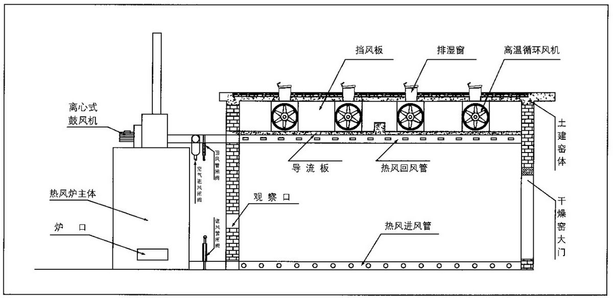 熱風式干燥設備工作原理是利用燃燒產生的熱能,加熱窯內的空氣,由熱風爐頂部主風機將窯內的空氣通過管道吸入爐體,將空氣加熱。再通過管道,送入窯內,由窯內的循環風機不斷的循環對窯內的木材均勻加熱。木材干燥過程中如需要蒸汽,可由熱風爐內的蒸汽發生器提供,如果是一爐兩房或多房時,管道上裝有插閥,通過插閥的調節來控制窯內的溫度。在干燥的過程中,由于木材要進行排濕,在窯頂上留有排濕孔(根據地區而定)和裝有抽濕機,用來調節排濕的快慢.